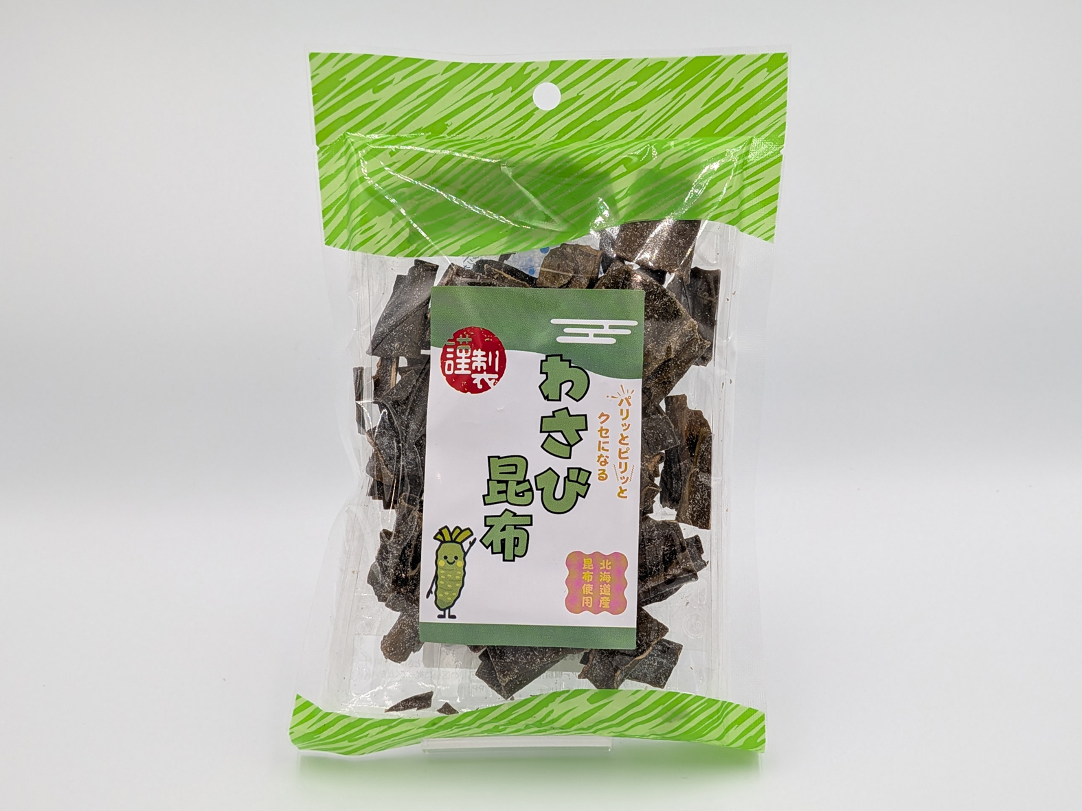 わさびがしっかりきいている大人の昆布のお菓子です。パリパリ食感でヘルシーなスナックです。