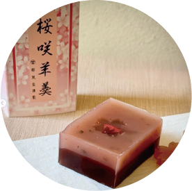 白あんをベースに桜の花などで桜色に染め上げた、ほんのり桜の香りが漂う羊羹。淡いピンク色が春らしさを演出します。